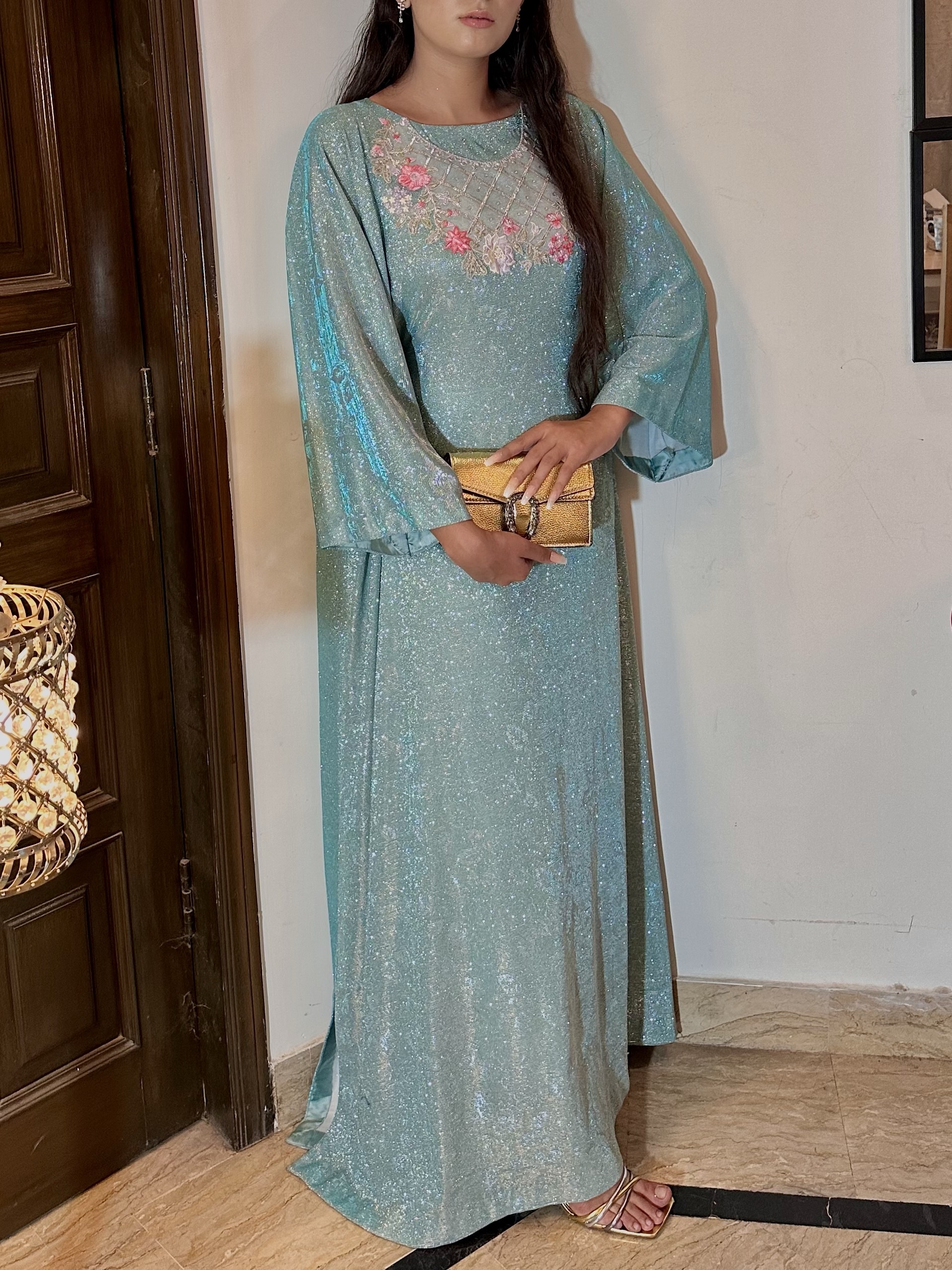 Elevate your evening look with this stunning turquoise glitter kaftan. Made from rose-patterned fabric and detailed with floral embroidery around the neckline, it blends grace with sparkle. Style it loose for flowy elegance or cinch it at the waist with hidden inner belts for a sculpted silhouette. Perfect for nights that call for effortless glamour. 🌙
